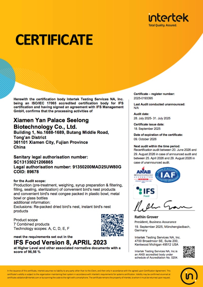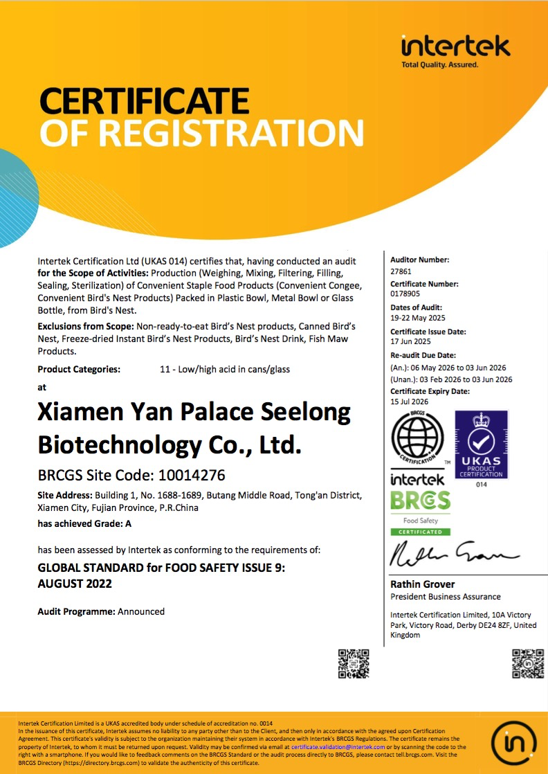 隨著“健康中國(guó)”戰(zhàn)略的深入推進(jìn),健康產(chǎn)業(yè)迎來(lái)前所未有的發(fā)展機(jī)遇。燕之屋深耕燕窩行業(yè),在健康產(chǎn)業(yè)賽道篤定前行,以高品質(zhì)鑄就卓越品牌,成為中國(guó)乃至全球燕窩行業(yè)率先獲得BRC食品安全全球標(biāo)準(zhǔn)、IFS國(guó)際食品標(biāo)準(zhǔn)雙重認(rèn)證的燕窩品牌。這些國(guó)際認(rèn)可的取得,彰顯了燕之屋對(duì)品質(zhì)的堅(jiān)守,也為中國(guó)滋補(bǔ)品贏得了國(guó)際聲譽(yù)。